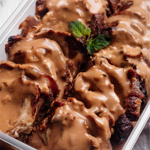 Oven-roasted porkloin with hints of Dijon mustard and white wine, served in a paprika cream sauce.